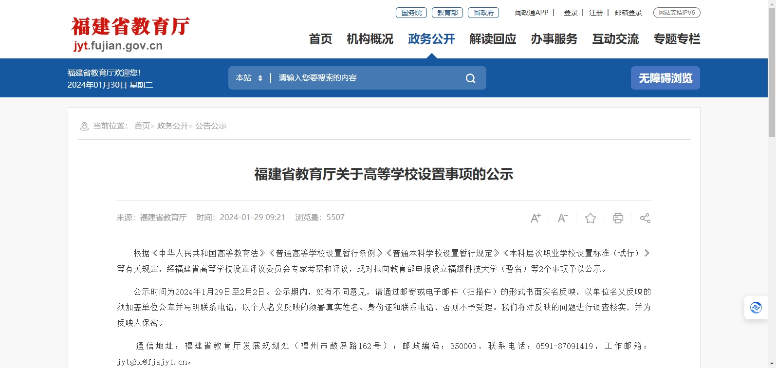 2024年1月29日,福建省教育廳官方網(wǎng)站發(fā)布《福建省教育廳關(guān)于高等學(xué)校設(shè)置事項(xiàng)的公示》。公示中稱,根據(jù)《中華人民共和國高等教育法》《普通高等學(xué)校設(shè)置暫行條例》《普通本科學(xué)校設(shè)置暫行規(guī)定》《本科層次職業(yè)學(xué)校設(shè)置標(biāo)準(zhǔn)(試行)》等有關(guān)規(guī)定,經(jīng)福建省高等學(xué)校設(shè)置評(píng)議委員會(huì)專家考察和評(píng)議,現(xiàn)對擬向教育部申報(bào)設(shè)立福耀科技大學(xué)(暫名)等2個(gè)事項(xiàng)予以公示。