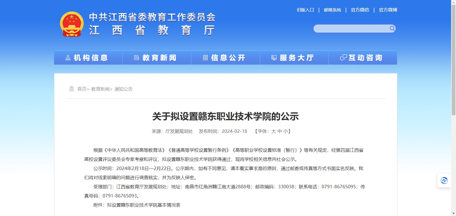 根據(jù)《中華人民共和國高等教育法》《普通高等學(xué)校設(shè)置暫行條例》《高等職業(yè)學(xué)校設(shè)置標(biāo)準(zhǔn)(暫行)》等有關(guān)規(guī)定,經(jīng)第四屆江西省高校設(shè)置評議委員會專家考察和評議,擬設(shè)置贛東職業(yè)技術(shù)學(xué)院獲得通過,現(xiàn)將學(xué)校相關(guān)信息向社會公示。