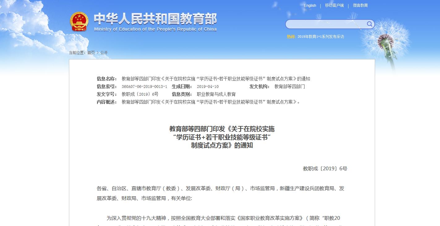 2019年,職業(yè)教育的‘一盤大棋’正在推進,改革逐步進行。近日,教育部等四部門印發(fā)《關(guān)于在院校實施“學(xué)歷證書+若干職業(yè)技能等級證書”制度試點方案》的通知,對國務(wù)院印發(fā)的《國家職業(yè)教育改革實施方案》中提......