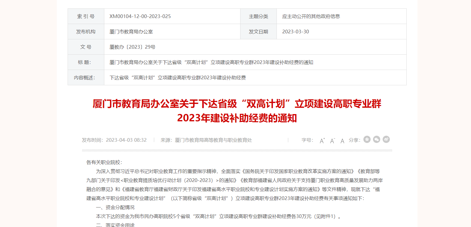 近日,廈門市教育局發(fā)布《關(guān)于下達(dá)省級“雙高計(jì)劃”立項(xiàng)建設(shè)高職專業(yè)群2023年建設(shè)補(bǔ)助經(jīng)費(fèi)的通知》,為我市民辦高職院校5個(gè)省級“雙高計(jì)劃”立項(xiàng)建設(shè)高職專業(yè)群建設(shè)補(bǔ)助經(jīng)費(fèi)各30萬元。 ......