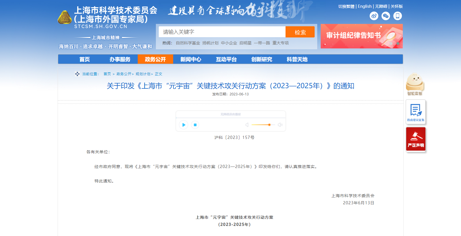 上海市發(fā)布《上海市“元宇宙”關(guān)鍵技術(shù)攻關(guān)行動方案(2023—2025年)》的通知