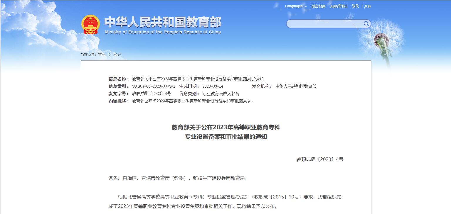 日前,教育部組織完成了2023年高等職業(yè)教育??茖I(yè)設(shè)置備案和審批相關(guān)工作,并公布結(jié)果,經(jīng)省級教育行政部門備案并在教育部匯總的2023年擬招生專業(yè)點共65808個,備案結(jié)果可在全國職業(yè)院校專業(yè)設(shè)置管理......