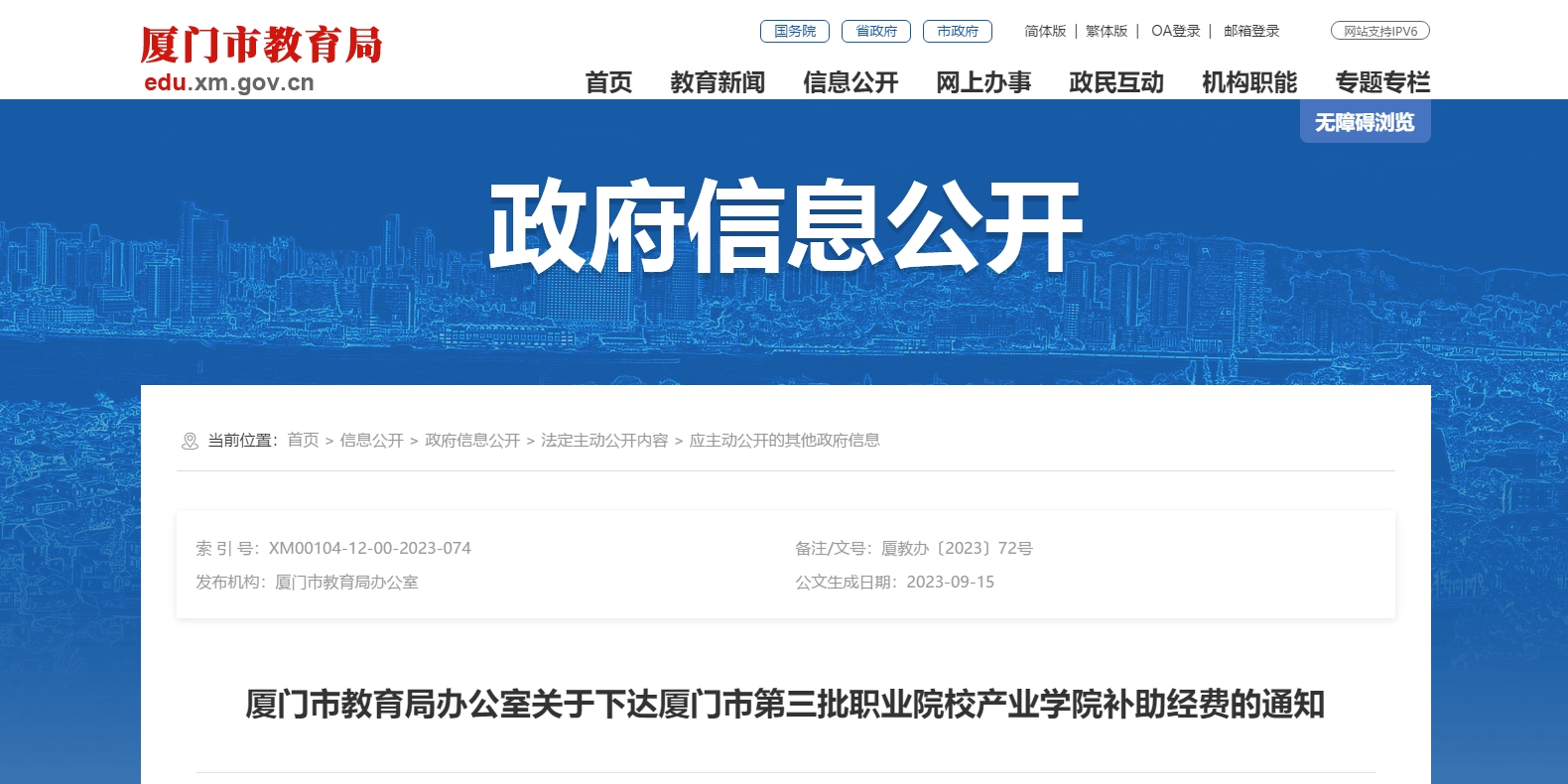 廈門市教育局發(fā)布下達廈門市第三批職業(yè)院校產(chǎn)業(yè)學院補助經(jīng)費通知