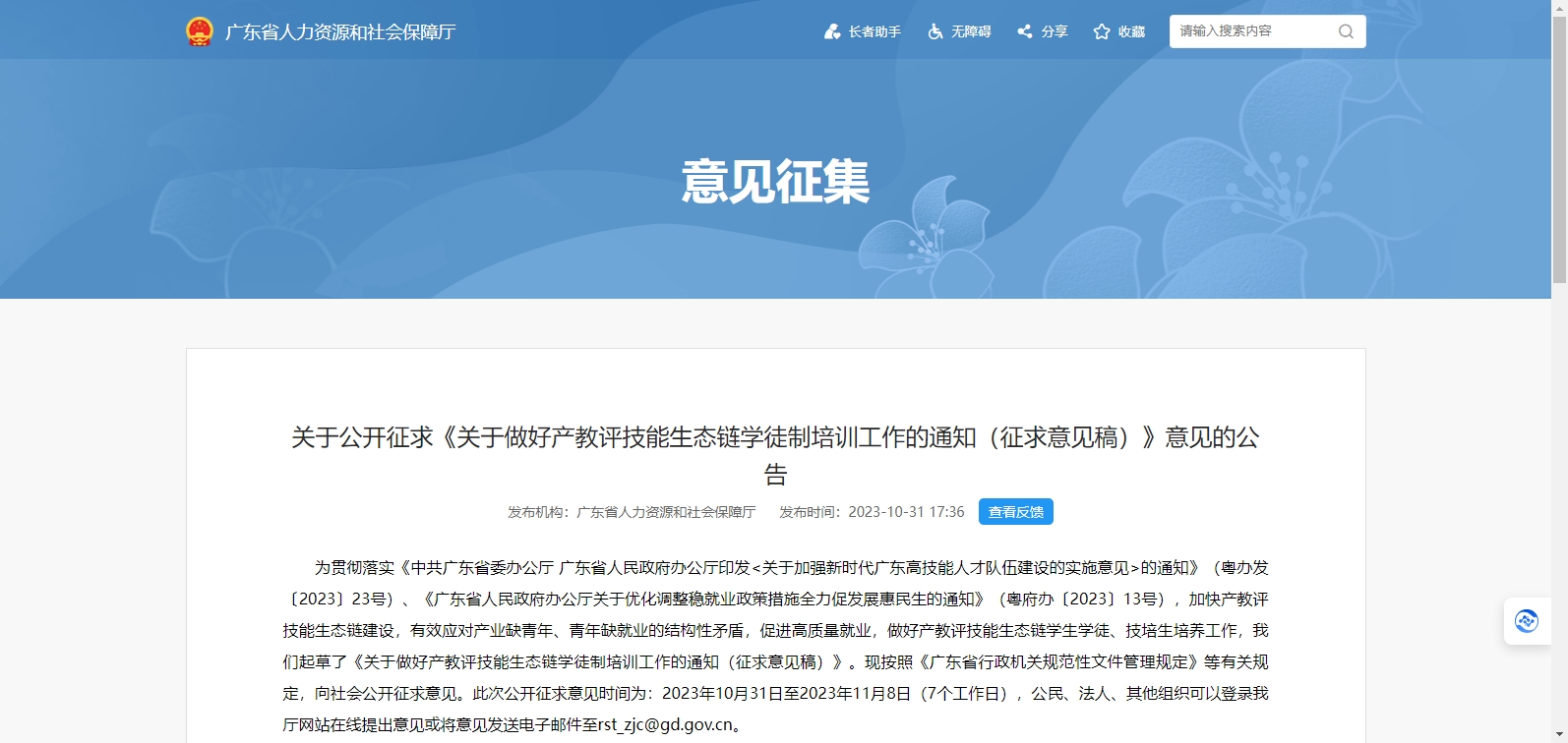 近日,廣東省人力資源和社會保障廳在其官網(wǎng)發(fā)布關于公開征求《關于做好產(chǎn)教評技能生態(tài)鏈學徒制培訓工作的通知(征求意見稿)》意見的公告,按照《廣東省行政機關規(guī)范性文件管理規(guī)定》等有關規(guī)定,向社會公開征求意見......