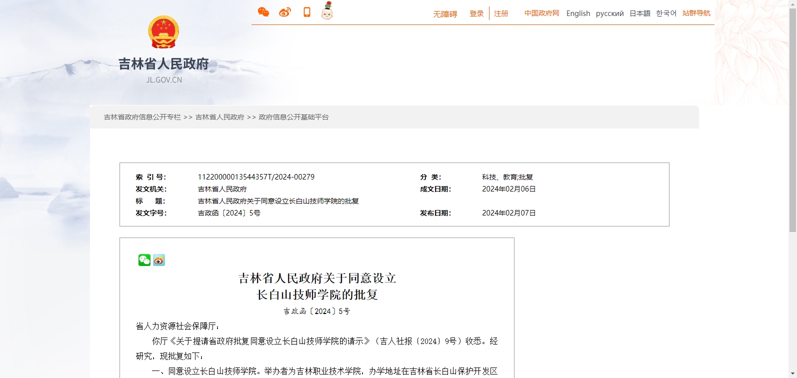吉林省人民政府關(guān)于同意設(shè)立長(zhǎng)白山技師學(xué)院的批復(fù) 吉政函〔2024〕5號(hào) 省人力資源社會(huì)保障廳: 你廳《關(guān)于提請(qǐng)省政府批復(fù)同意設(shè)立長(zhǎng)白山技師學(xué)院的請(qǐng)示》......