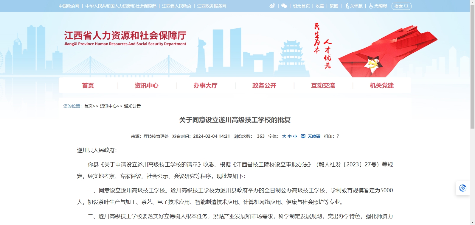 關(guān)于同意設(shè)立遂川高級(jí)技工學(xué)校的批復(fù) 遂川縣人民政府: 你縣《關(guān)于申請(qǐng)?jiān)O(shè)立遂川高級(jí)技工學(xué)校的請(qǐng)示》收悉。根據(jù)《江西省技工院校設(shè)立審批辦法》(贛人社發(fā)〔202......